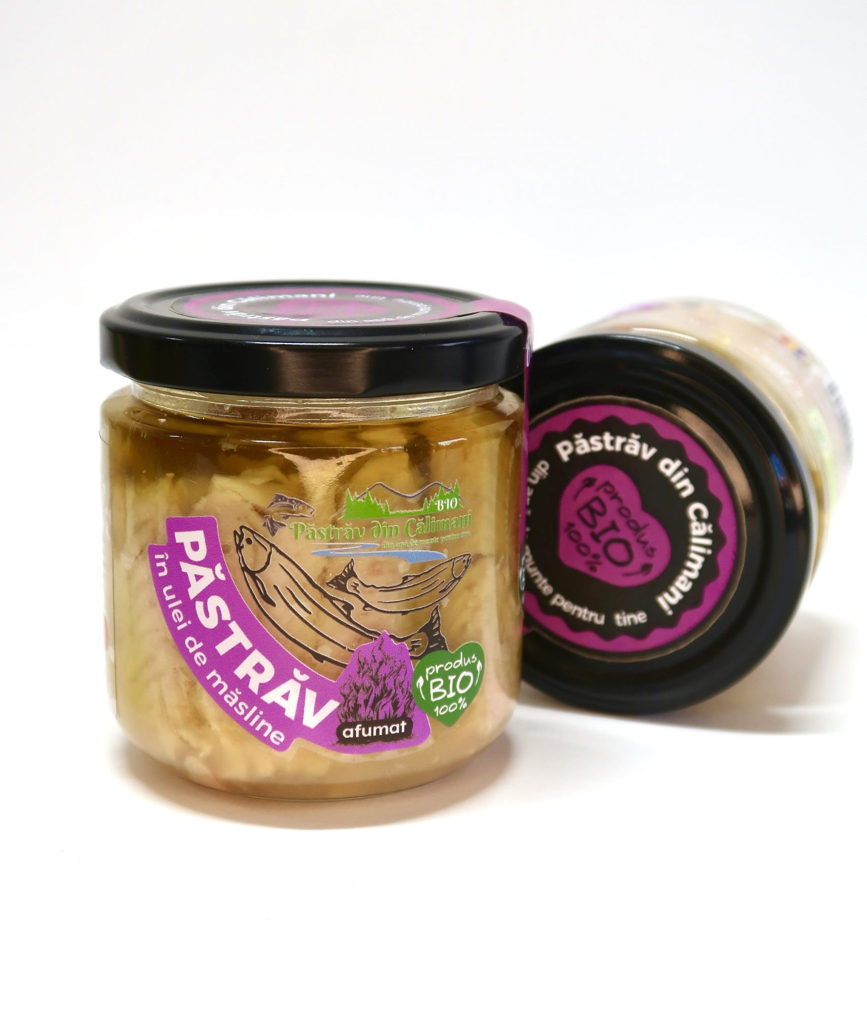 - Ingrediente: păstrăv Bio afumat, ulei de măsline Bio, sare, piper Bio, foi de dafin Bio, usturoi Bio, oțet Bio